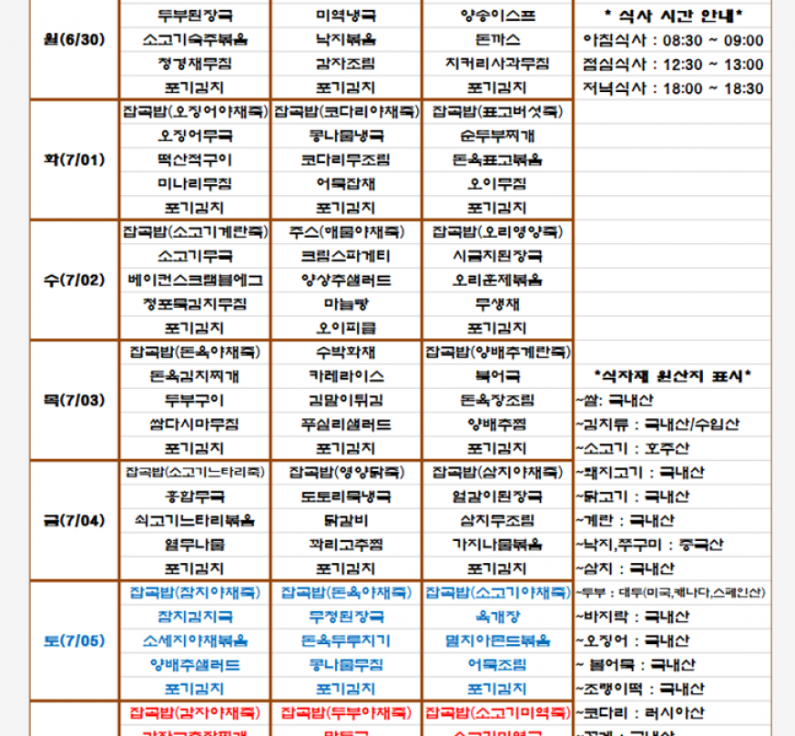 2025년 7월 1주 식단표를 공유합니다.