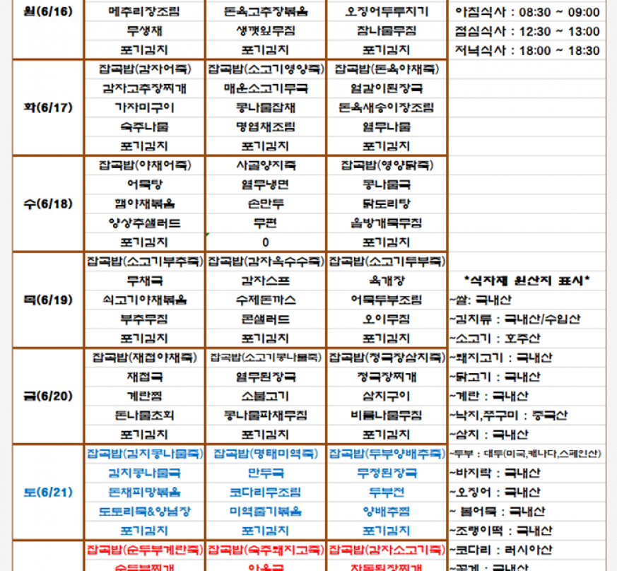 2025년 6월3주 식단표를 공유합니다.