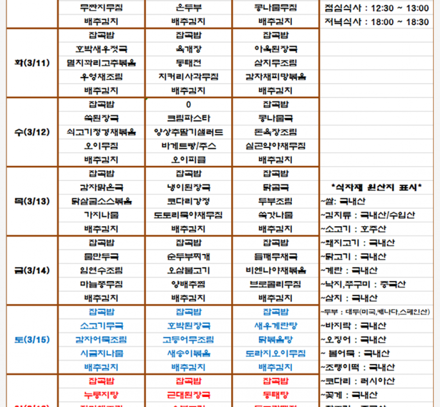 2025년 3월 2주 식단표를 공유합니다.